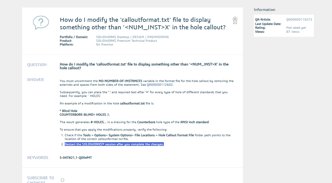 Any edits to the Hole Callout format folder (System Options > File Locations > Hole Callout) require restarting SOLIDWORKS for the file to be reloaded.
