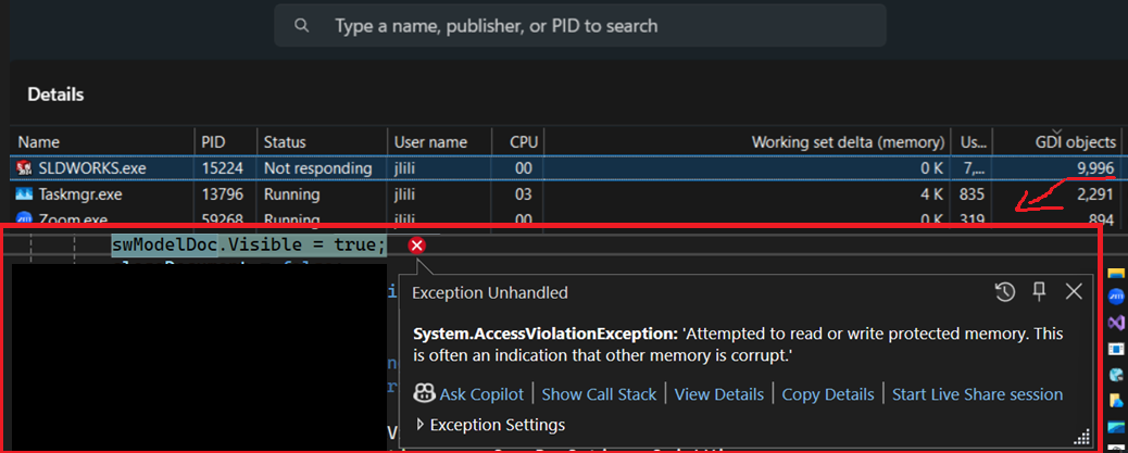 SOLIDWORKS can slowly accumulate GDI objects until it eventually crashes with an access violation.